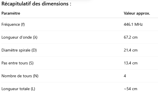Pas de la spirale (S) : ≈ 0.2 × λ ≈ 13.4 cm